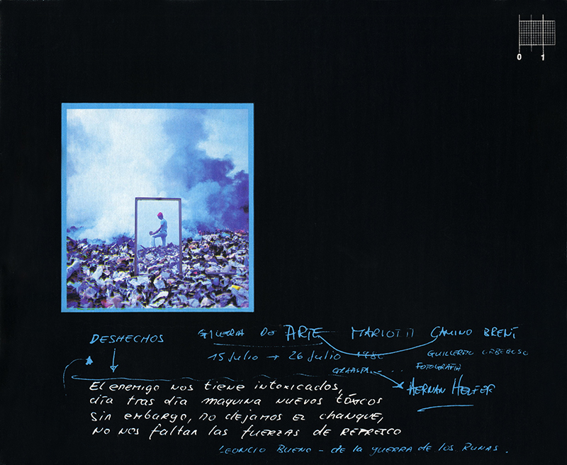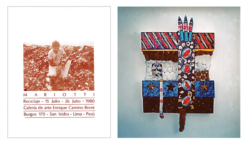 Así supo percibirlo el colectivo. Y muy particularmente Mariotti, quien [no vacilaba] en trasladar al relleno sanitario su propia producción artística, señalando a esos infinitos basurales como el único y verdadero y fáctico museo de arte moderno del Perú. En otra fotografía —publicada a todo color en el catálogo de su muestra [individual en la Galería Camino Brent]— el expositor aparece en gesto hamletiano entre las humeantes colinas de desechos, reflejado por un gran e insólito espejo que reproduce [de ese modo], en un registro “artístico”, el hiperrealismo brutal de lo que una sociedad descarta. Y reprime: aquellas fumarolas hablan de combustiones internas y energías ocultas, pugnando por emerger y manifestarse.