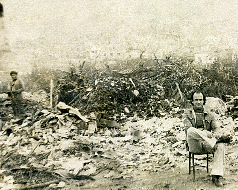 Lo que esa sociedad descarta, sin embargo, es también seres humanos. En la imagen deteriorada y entonces inédita que recuperé entre los escombros de E.P.S. Huayco, Mariotti posa para la cámara sentado sobre una silla en medio del botadero, mientras muy al extremo izquierdo una figura haraposa y acaso desquiciada asoma su cuerpo marginal. Más arriba, la proverbial bruma limeña deja apenas entrever los cerros que sirven de miserable morada a los millones de migrantes llamados a protagonizar una mesiánica revolución andina, en términos sexuales y políticos, por los poemas de Leoncio Bueno fragmentariamente recogidos en el catálogo de la exposición.5