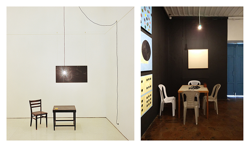 La tristeza también de Heberto Padilla, el poeta laico de la Revolución Cubana. Y de Kasimir Malévich, el pintor sacro de la Revolución Rusa. Ambos luego destruidos por la Revolución misma. Y aquí evocados por el gran mosaico de doce óleos sobre tela. En dominó-clave, frente a la real mesa de dominó, desplegada para el juego real de los espectadores (interactivos). Bajo el precario foco de luz incandescente (intermitente). Y con la otra mesa (intervenida), colgada sin patas sobre la pared obscura. El cuadrado “blanco” del arte sobre el recuadro “negro” de la historia. Fuera del juego (Padilla), precisamente.