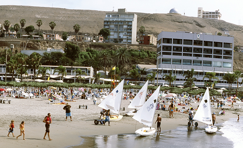 Sobre esas —y otras— fronteras nos hablan también dos impresionantes fotografías de Roberto Huarcaya. De la manera más explícita posible, pero no menos poética por ello. A esto contribuye su formato panorámico y en extremo apaisado, que sin embargo apunta a la horizontalidad deficiente en la sociedad peruana: el elemento decisivo en ambas tomas es un eje central y divisorio marcando siempre el centro de la composición. En la primera imagen (2009) se trata del muelle que separa, como una muralla virtual, la playa exclusiva del club Regatas de las orillas populares de Agua Dulce y Pescadores. En la segunda toma (2011) tenemos la muralla literal —incluso con alambre de púas— que impide el tránsito de las barriadas populares de Pamplona Alta a los condominios cerrados de Las Casuarinas.