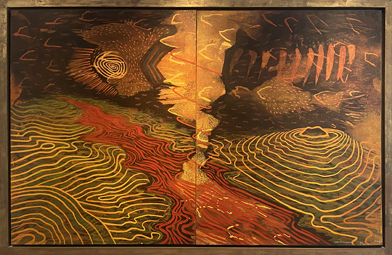 La alteridad de un Arte Otro, que se quiere también esotérico. Entre místico y alucinado. [Piénsese en Vincent Van Gogh]. Visionario: no poco de lo reunido en esta exposición antológica evidencia las trazas de indagaciones psicotrópicas acotadas durante las vivencias tempranas de Ruzo Ocampo. “Viajes” alucinógenos inducidos mediante substancias de habitual uso chamánico, con las influencias entrecruzadas de Timothy Leary y Aldous Huxley, verbigracia. Para “abrir el portal”. [Piénsese en William Blake, piénsese en The Doors]. Además, claro, de “Carlos Castaneda”, el constructo californiano para las mitomanías antropologizantes del cajamarquino Carlos Arana Castañeda, que tanto fascinaron a los movimientos New Age en el mundo entero.