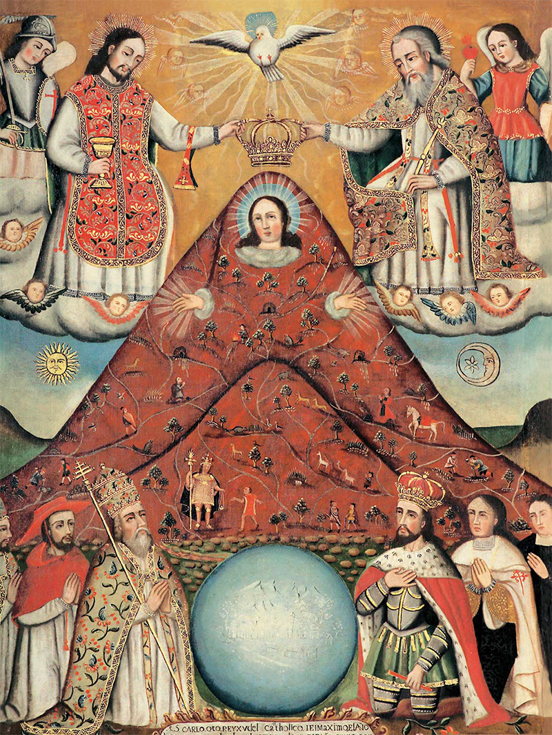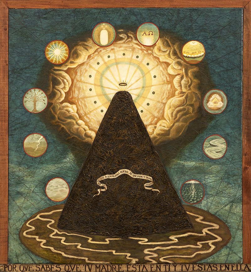 A la Tierra y a sus imágenes: Virgen – Montaña es el título del cuadro que da emblema a esta “obertura” textual y a la exposición entera. Una transfiguración que podría ser Mariana. Pagana y cristiana al mismo tiempo. [Piénsese en la Virgen – Cerro de Potosí].